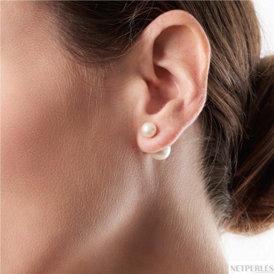 Paire de boucles d'Oreilles en Argent 925 en perles de culture d'eau douce Recto Verso qui habille le devant et l'arrière du lobe avec de belles perles de culture d'eau douce. La perle devant est une perle d'eau douce bien ronde dont le diamètre mesure environ 6 mm, la perle située à l'arrière du lobe est une perle de culture d'eau douce de forme ovale et de diamètre d'environ 9,5 mm. Les perles sont de qualité AAA, haut de gamme.