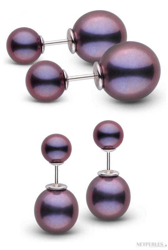 Boucles d'Oreilles en Argent 925 Recto Verso de perles de culture d'eau douce qualité AAA, avec une perle ronde 6 mm devant et une perle ovale 9,5 mm au verso.