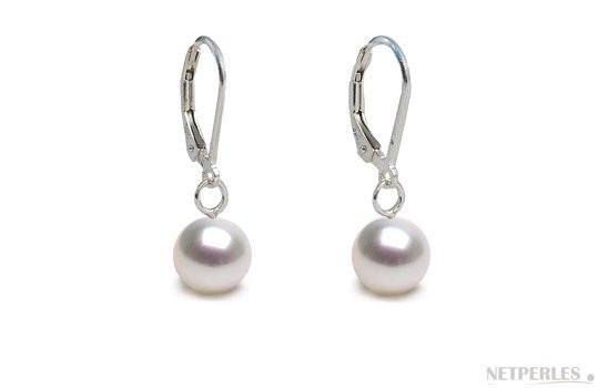 Boucles d'Oreilles en Argent 925 rhodié avec perles de culture d'Akoya blanches du Japon, qualité AA+ ou AAA diamètre à partir de 7-7,5 mm