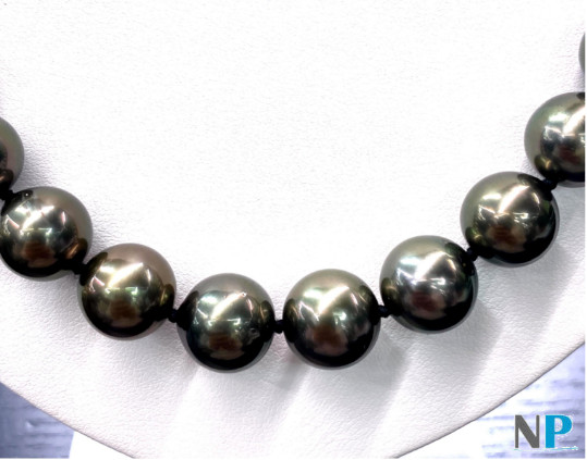 Collier de perles de culture de Tahiti 10-12 mm Qualité AA/AA+, perles bien rondes très brillantes couleur de base gris foncé, longueur de 43/44 cm