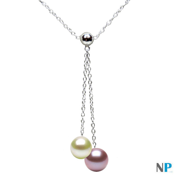 Collier de perles d'eau douce, deux perles en chute sur une chaine moderne en Argent 925 rhodié, perles de 8-9 mm à 10-11 mm, diamètres et couleurs au choix