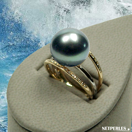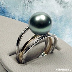 Bague Or gris et diamants avec perle de culture de Tahiti à partir de 9 à 10 mm qualité AAA