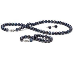 Parure de perles de Culture d'Eau Douce noires qualité AA+ ou AAA 7 à 8 mm composée d'un Collier, d'un Bracelet et d'une paire de boucles d'Oreilles