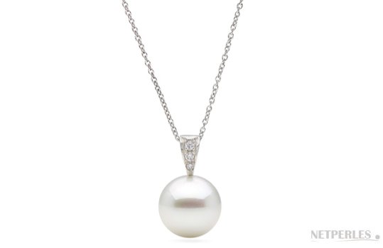 Ce pendentif très élégant est composé d'une bélière en Or 14 carats, ornée de diamants pour total de 0,05 carats de qualité VS-G, et d'une très belle perle d'Australie blanche argentée parfaitement ronde, qualité AAA, une magnifique perle de diamètre au choix à partir de 9-10 mm.