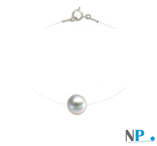 Pendentif/Collier avec un Perle d'Australie grise claire argentée traversée par un lien invisible de nylon de longueur de 40, 42 ou 45 cm, diamètre de la perle de 9-10 mm AAA, fermoir en Argent 925