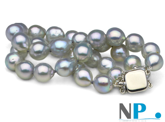 Bracelet double rang de perles de culture d'Akoya Baroques bleu Argenté naturelles de 8,0 à 8,5 mm, 18 cm. Perles très rares! Fermoir en Argent 925 ou en or 14 ou 18 carats