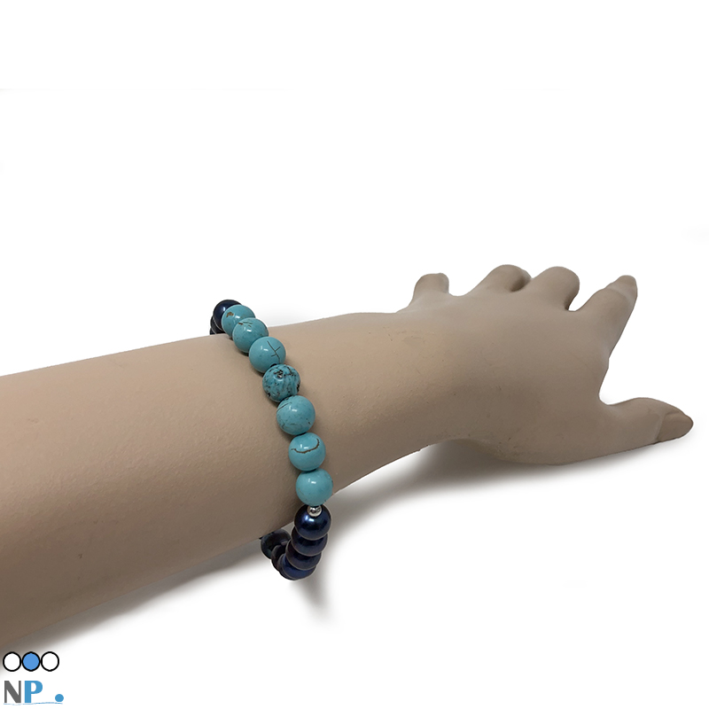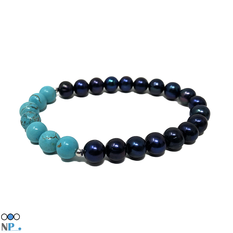 Bracelet de perles de culture d'Eau Douce noires aux reflets bleu nuit de 7 à 8 mm en qualité AA+ avec d'authentiques turquoises du Pérou à la couleur extraordinaire. Le mariage des deux gemmes (Perles de culture d'Eau Douce bleu nuit et Turquoise) forme une harmonie très élégante. Ce type de bracelet est très à la mode, qu'il s'agisse des Perles issues des mollusques ou des Pierres dont l'origine remonte à des milliers d'années.