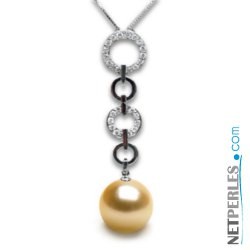 Pendentif original en Or 18 carats (jaune ou gris) serti de diamants pour 0,25 carats au total sur deux des anneaux le composant mettant en valeur, par la forme du pendentif, la perle dorée des Philippines à partir de 10 à 11 mm de qualité AAA