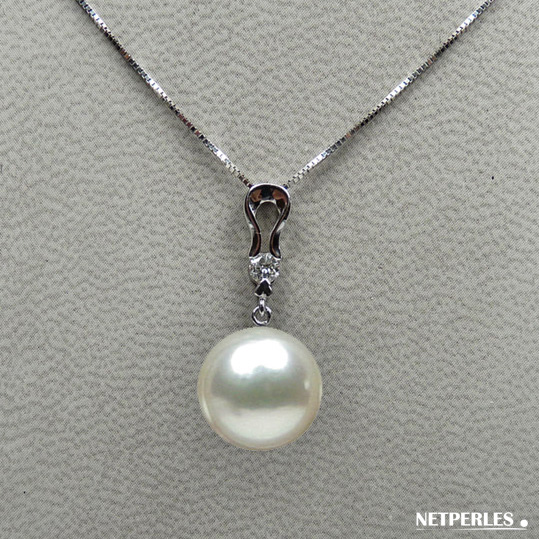 Pendentif Or gris 18 carats et diamant avec perle de culture d'Australie Blanche de 10 à 11 mm