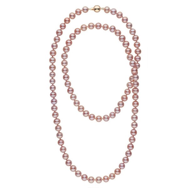 Etonnant collier de perles de culture d'eau douce 8-9 mm, teinte naturelle lavande. Proposé en qualité AA+ et AAA ce collier mesurant 114 cm est tout simplement renversant.